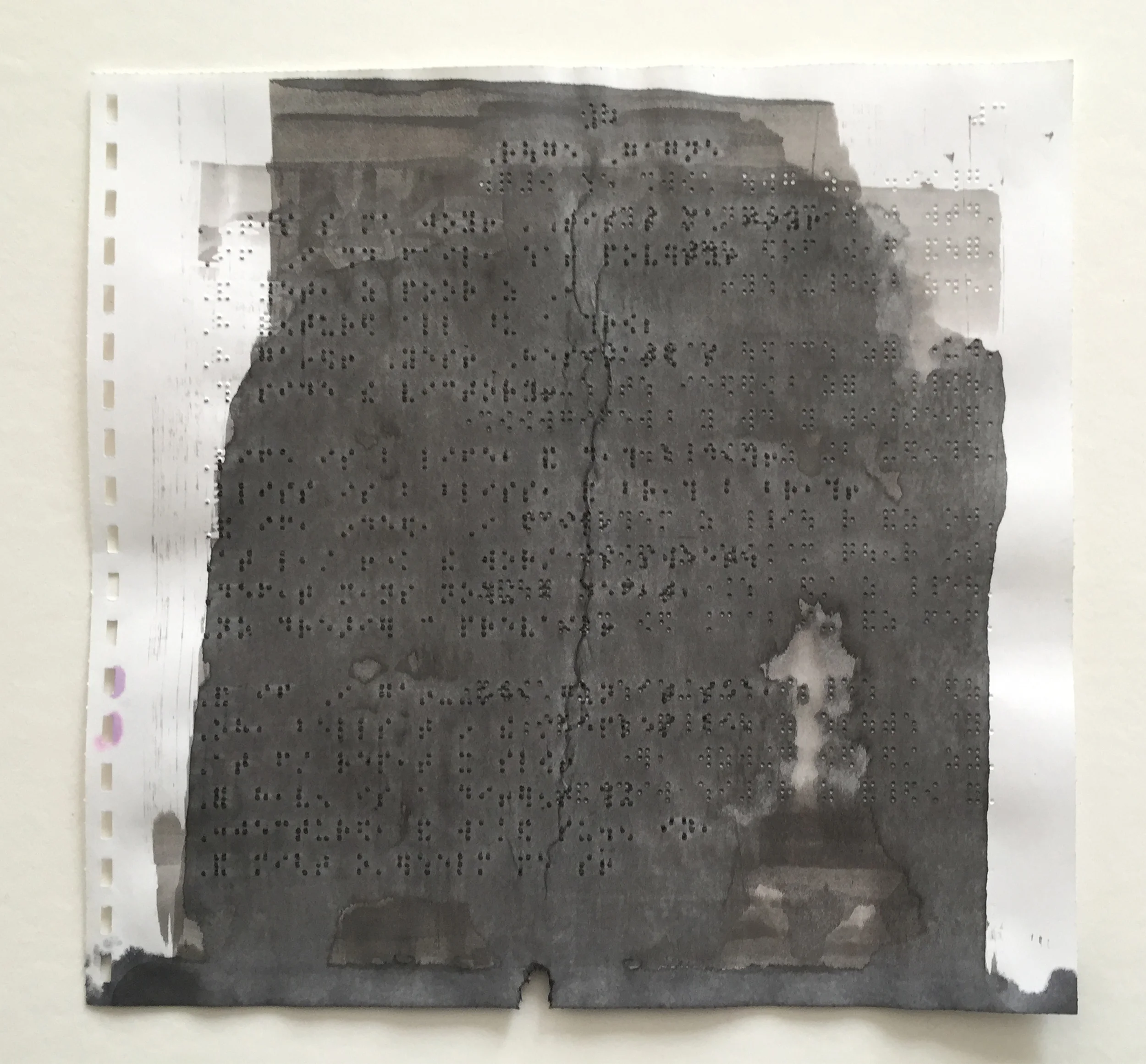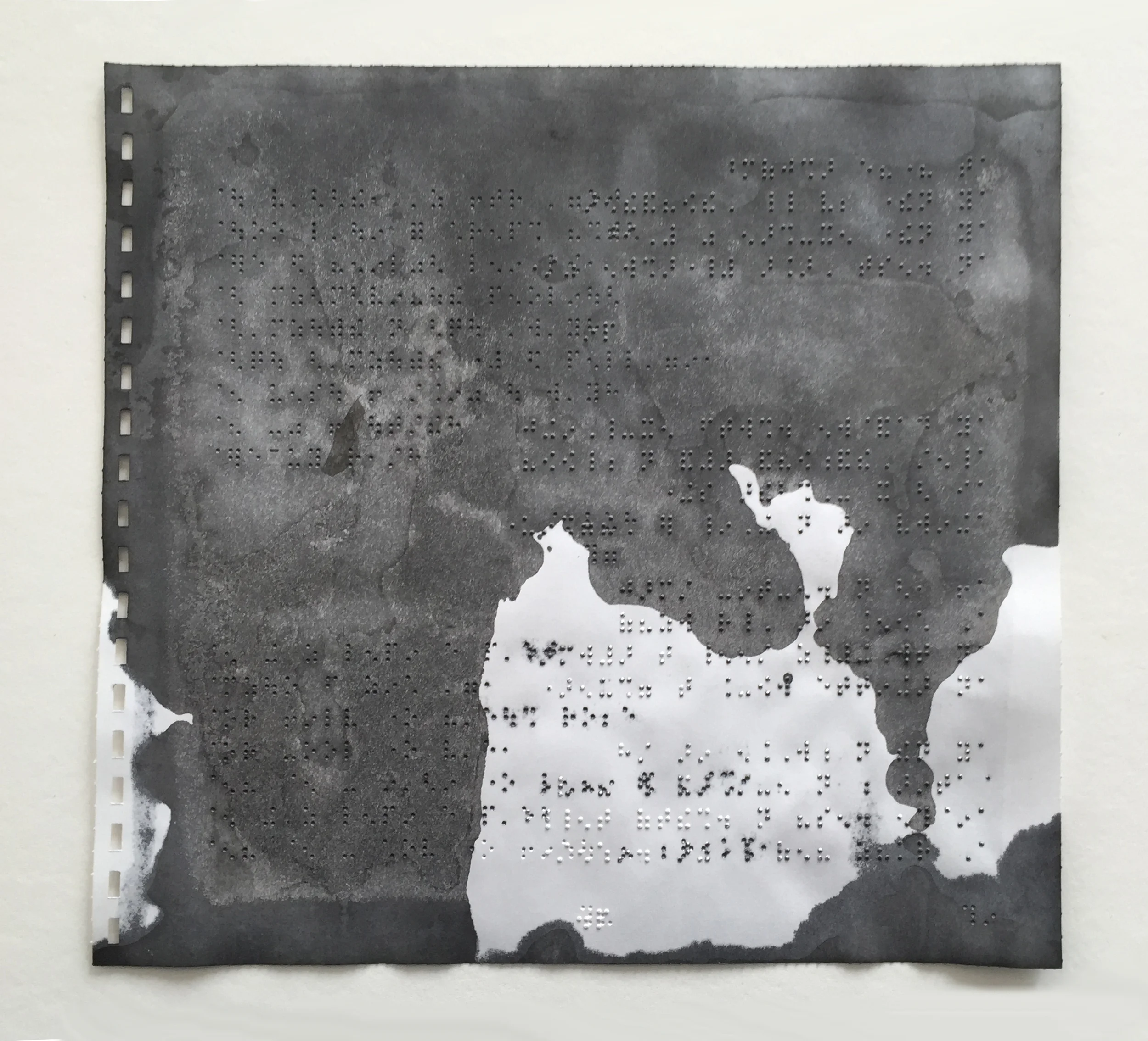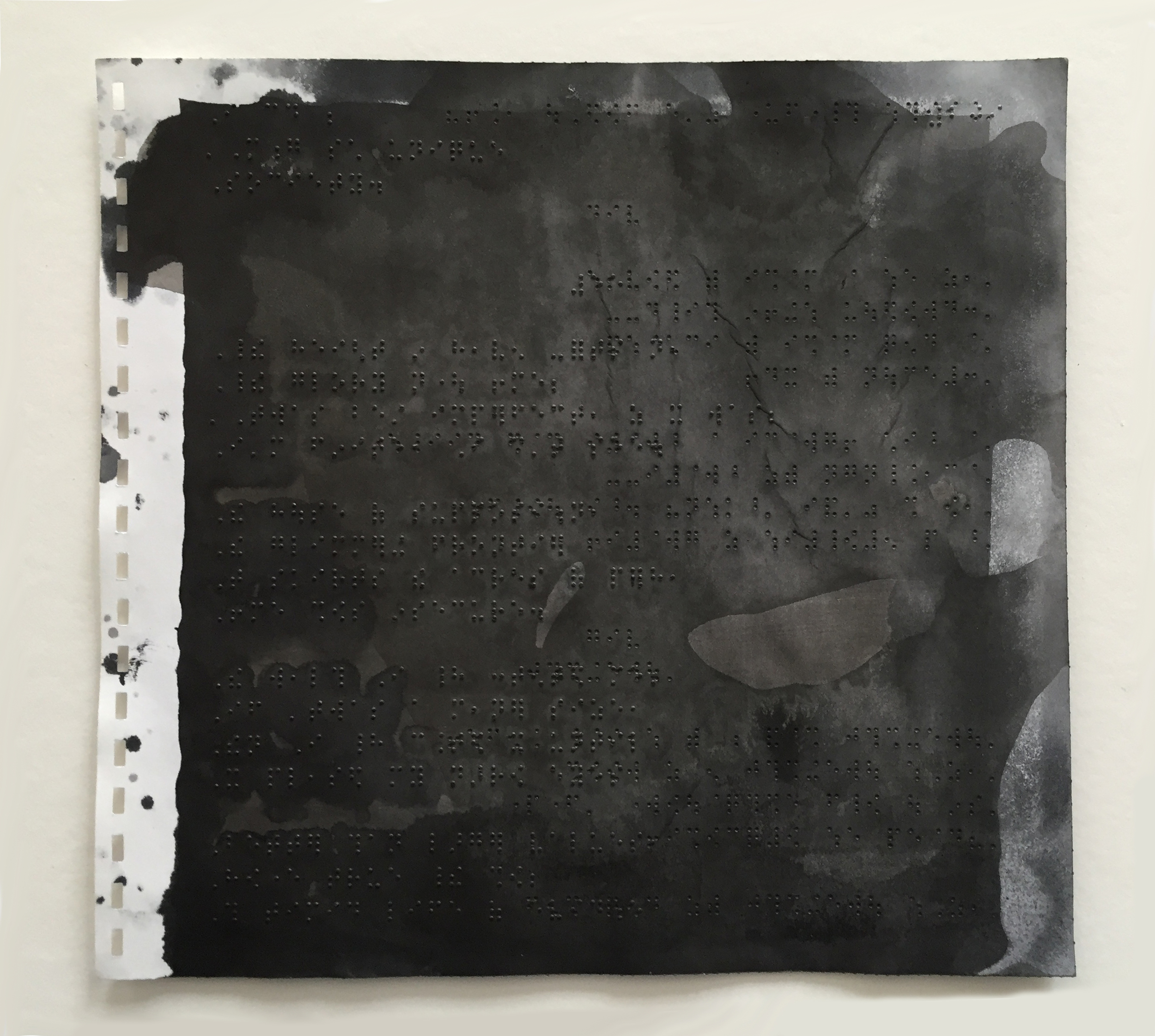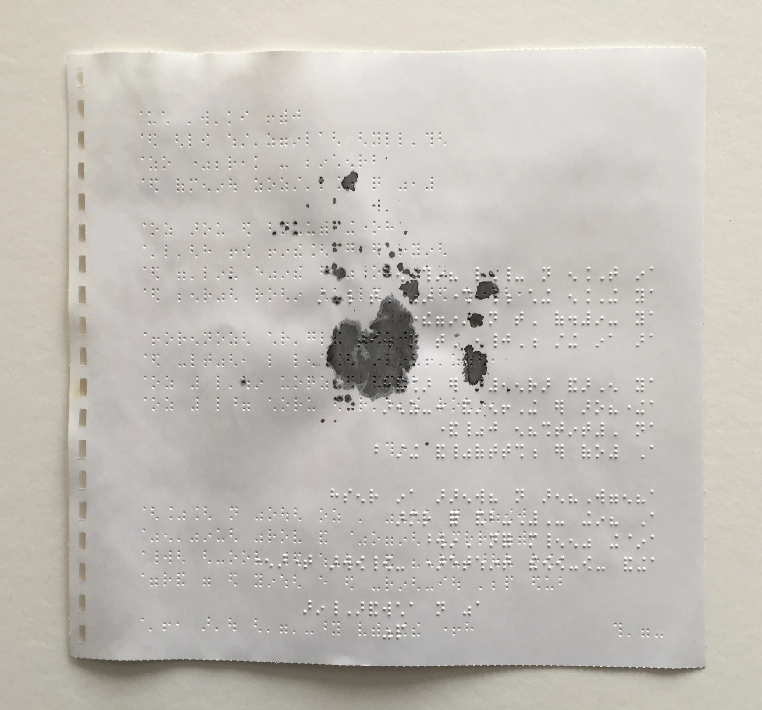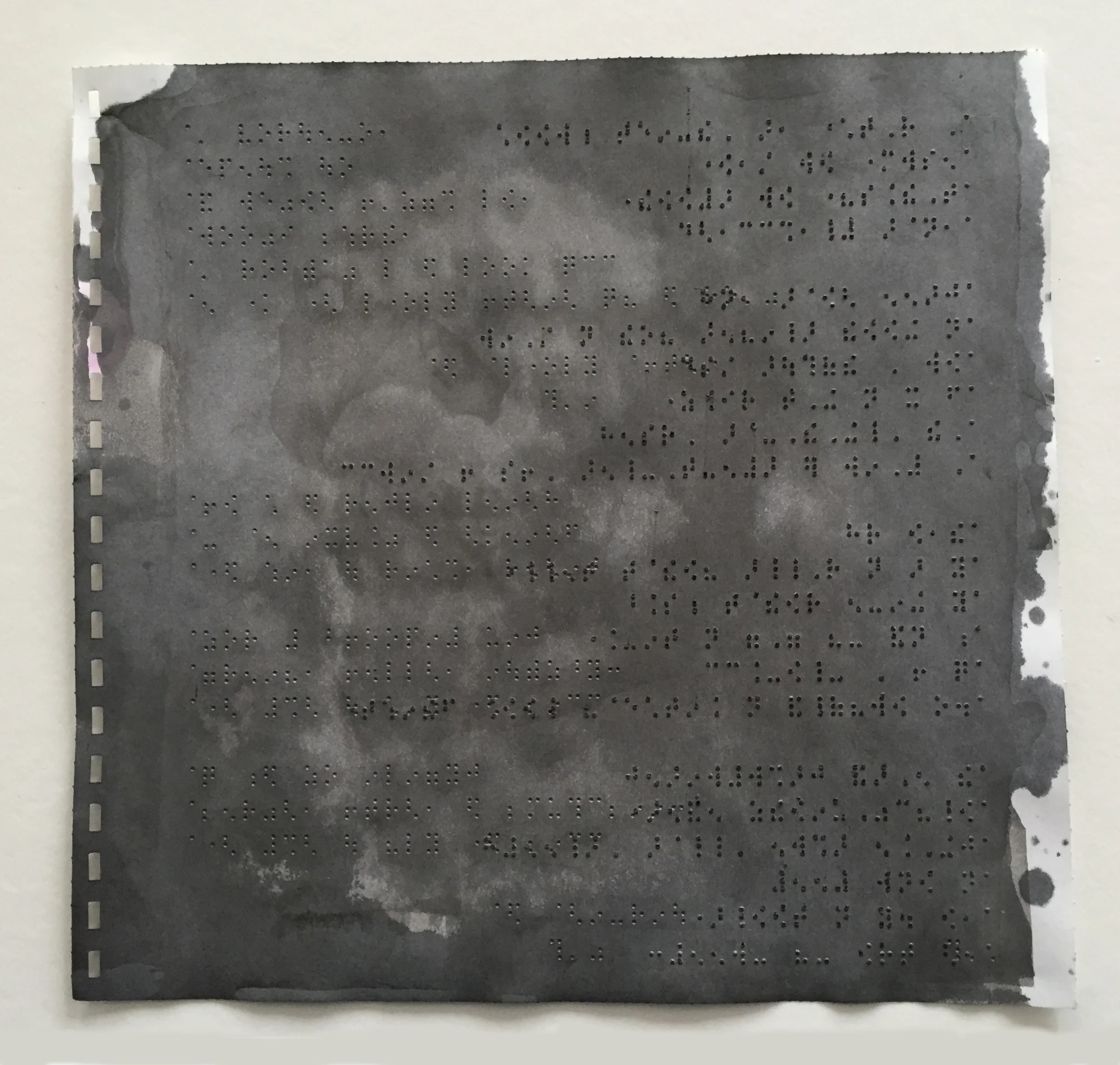 These pieces are from a book of Emily Dickinson poems in Braille. For pages 65 through 76, I dipped my fingers in ink, closed my eyes, and typed Dickinson's poem Two Worlds.