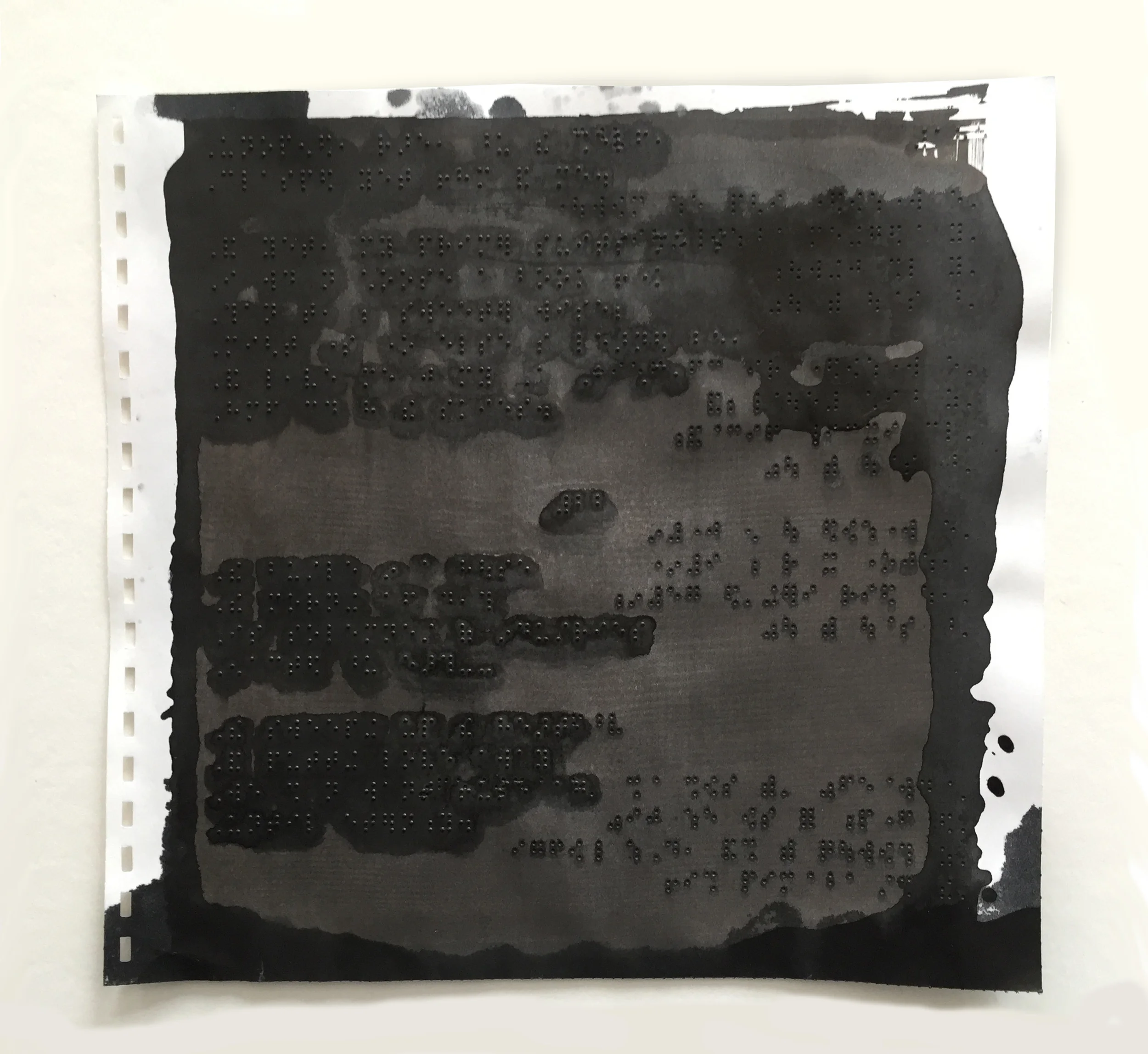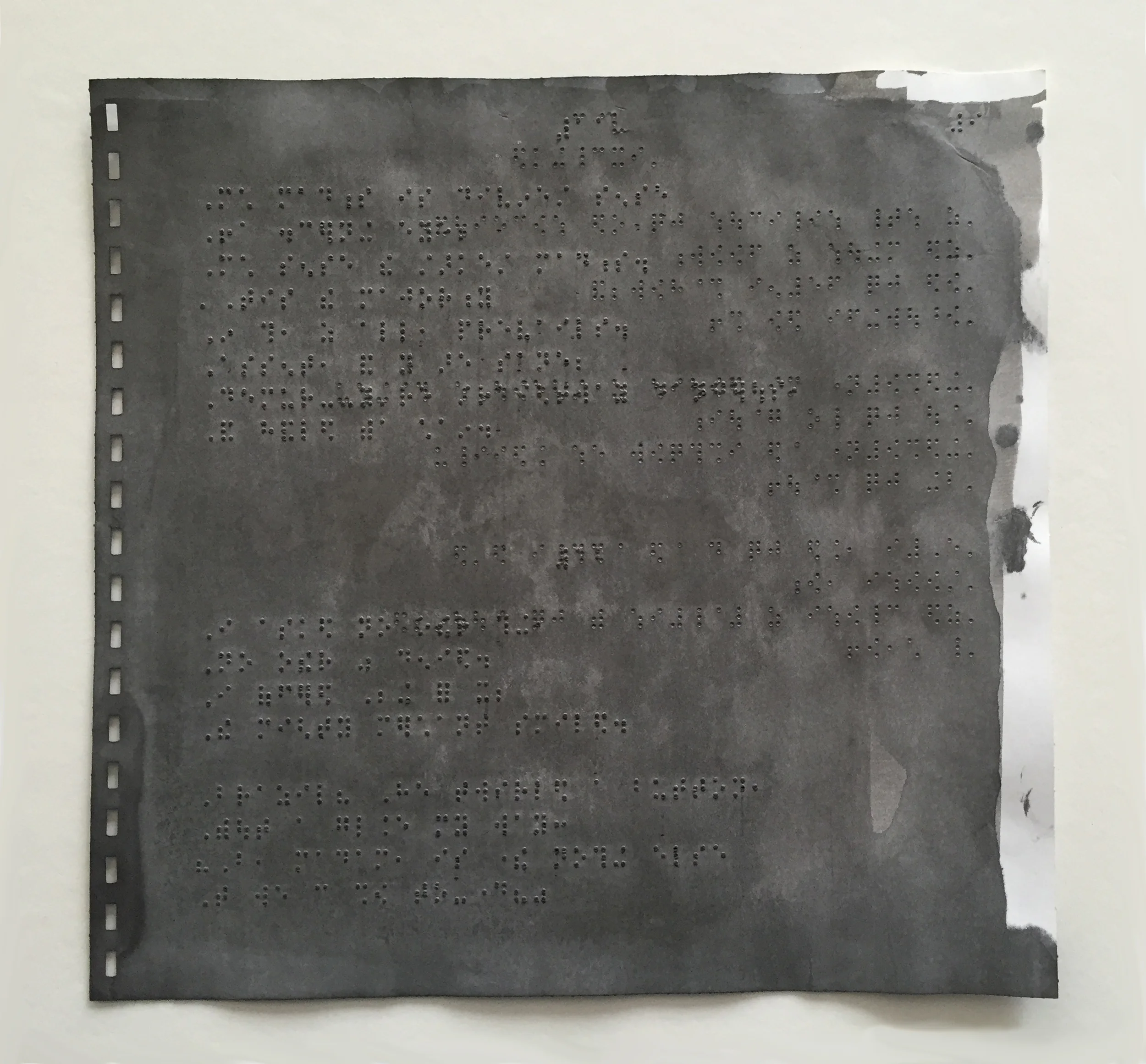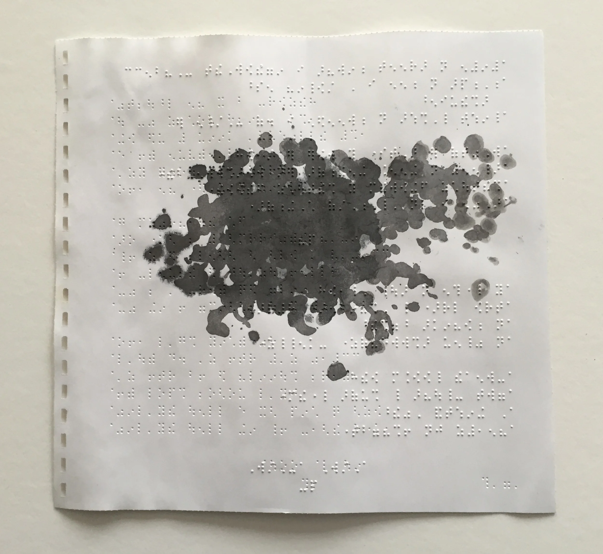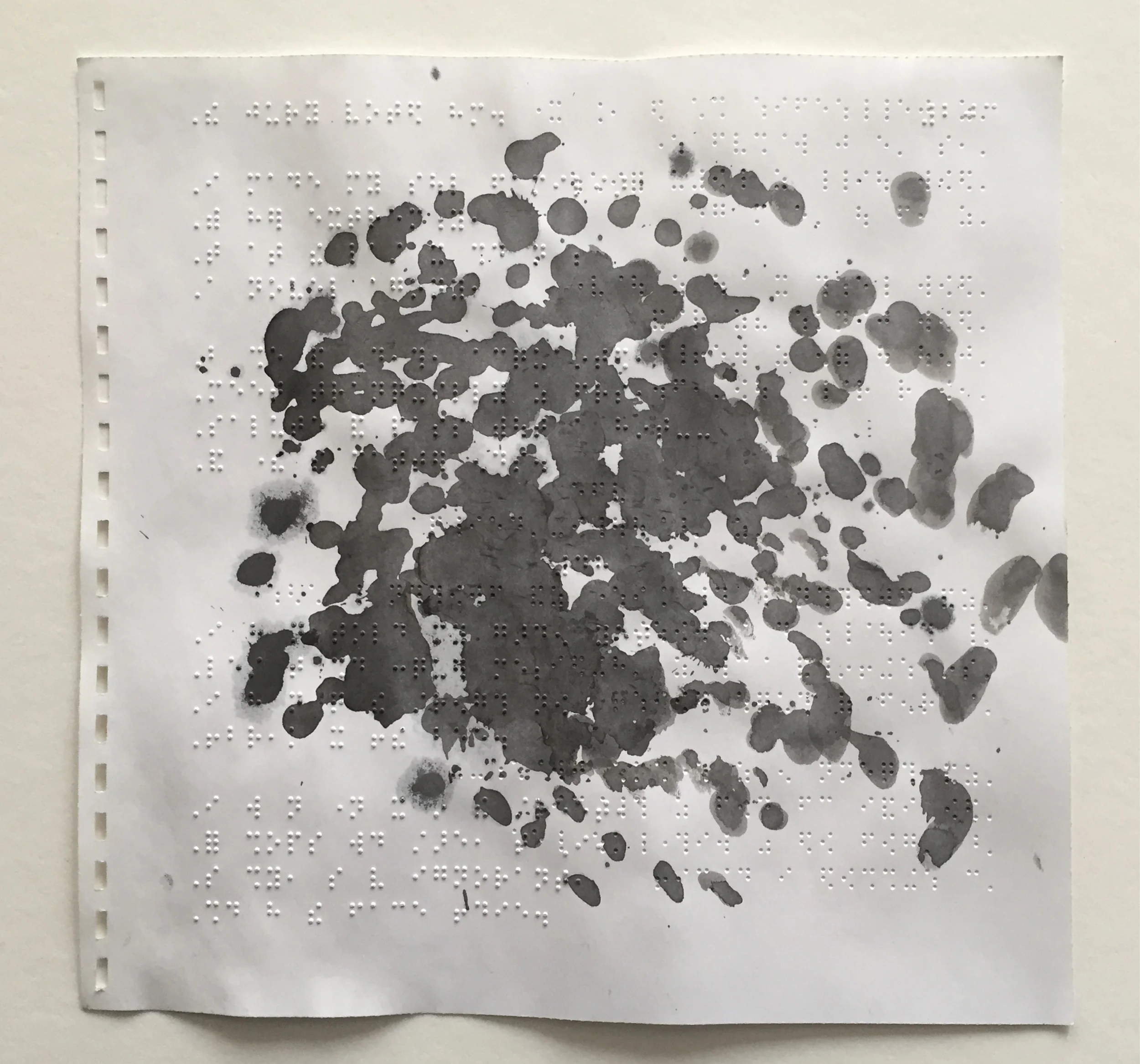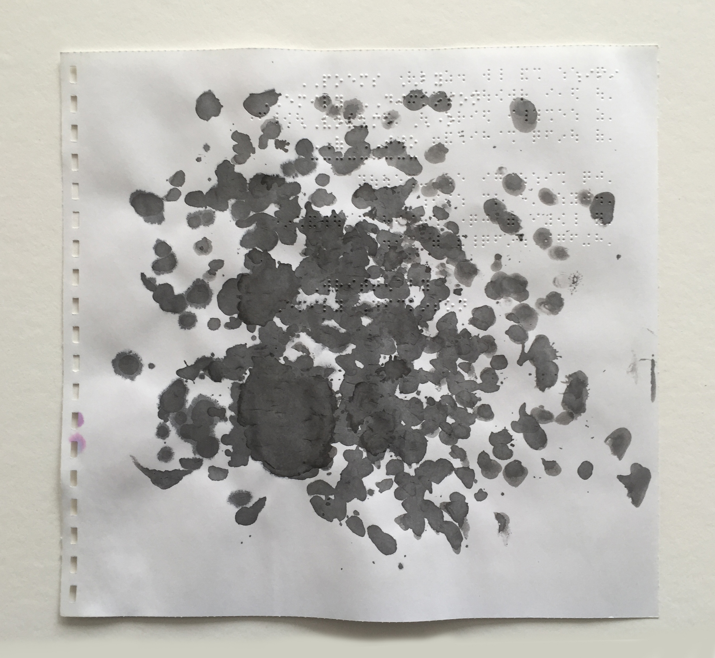 These pieces are from a book of Emily Dickinson poems in Braille. For pages 65 through 76, I dipped my fingers in ink, closed my eyes, and typed Dickinson's poem Two Worlds.