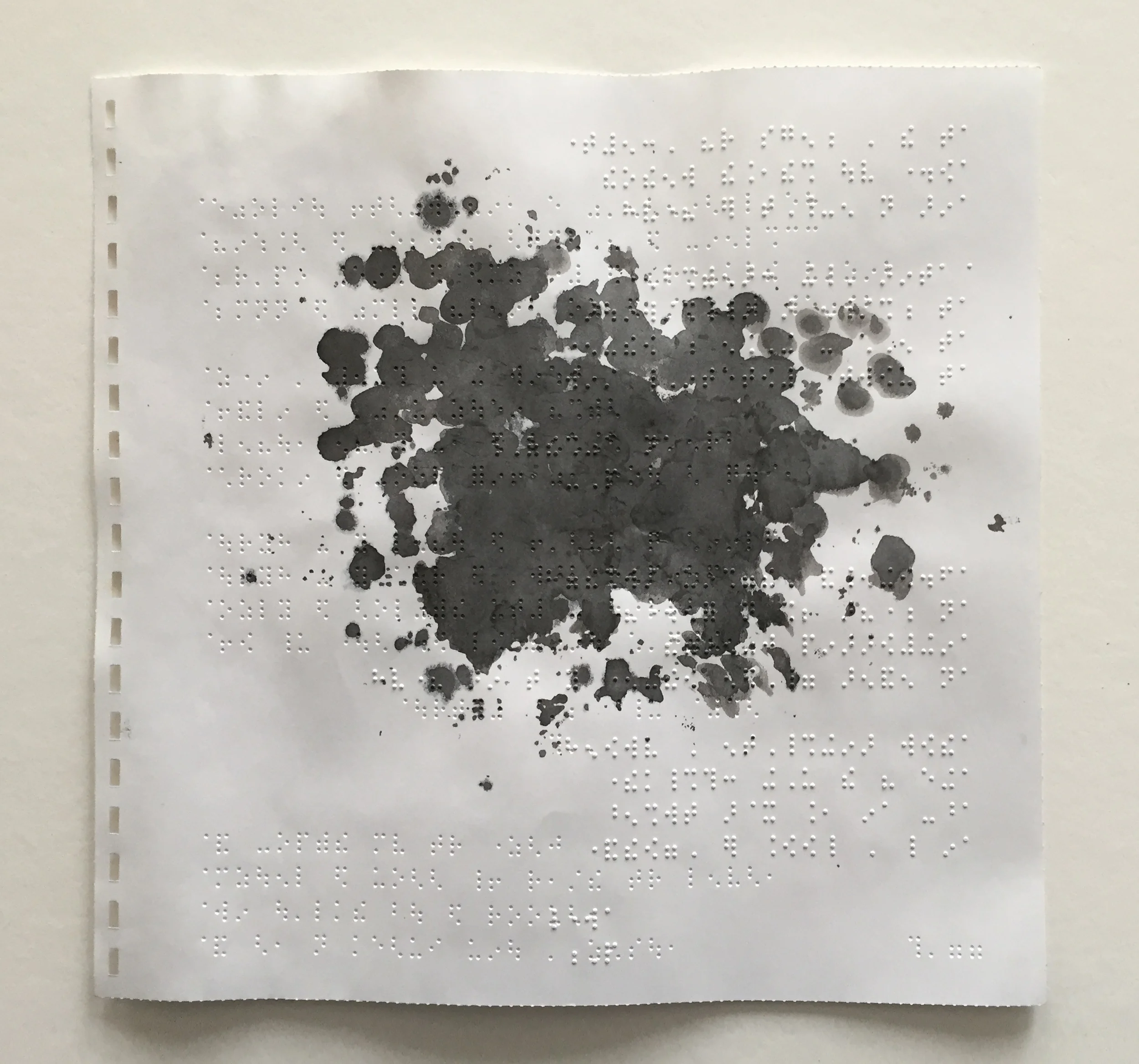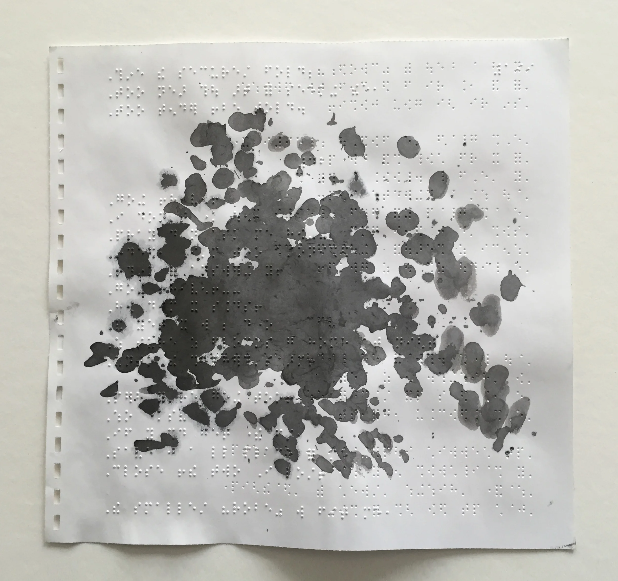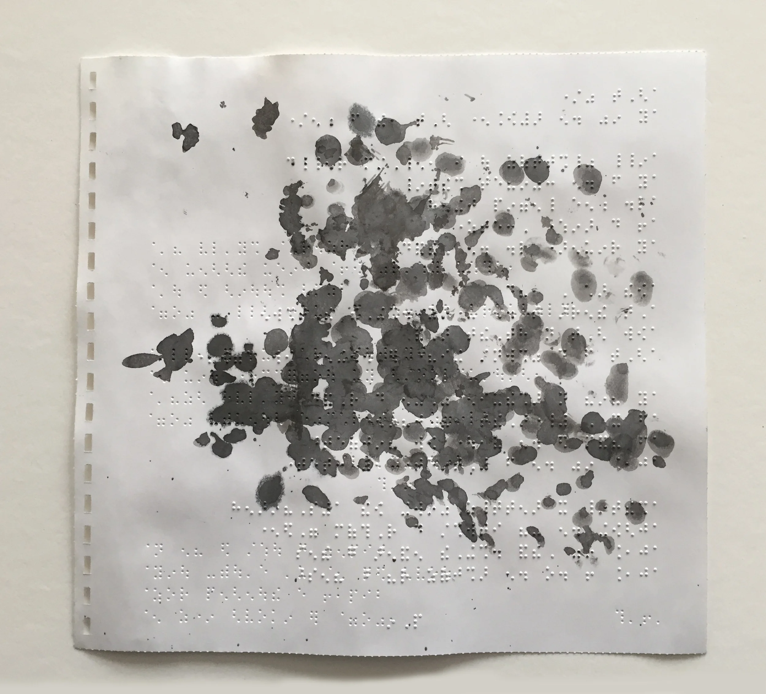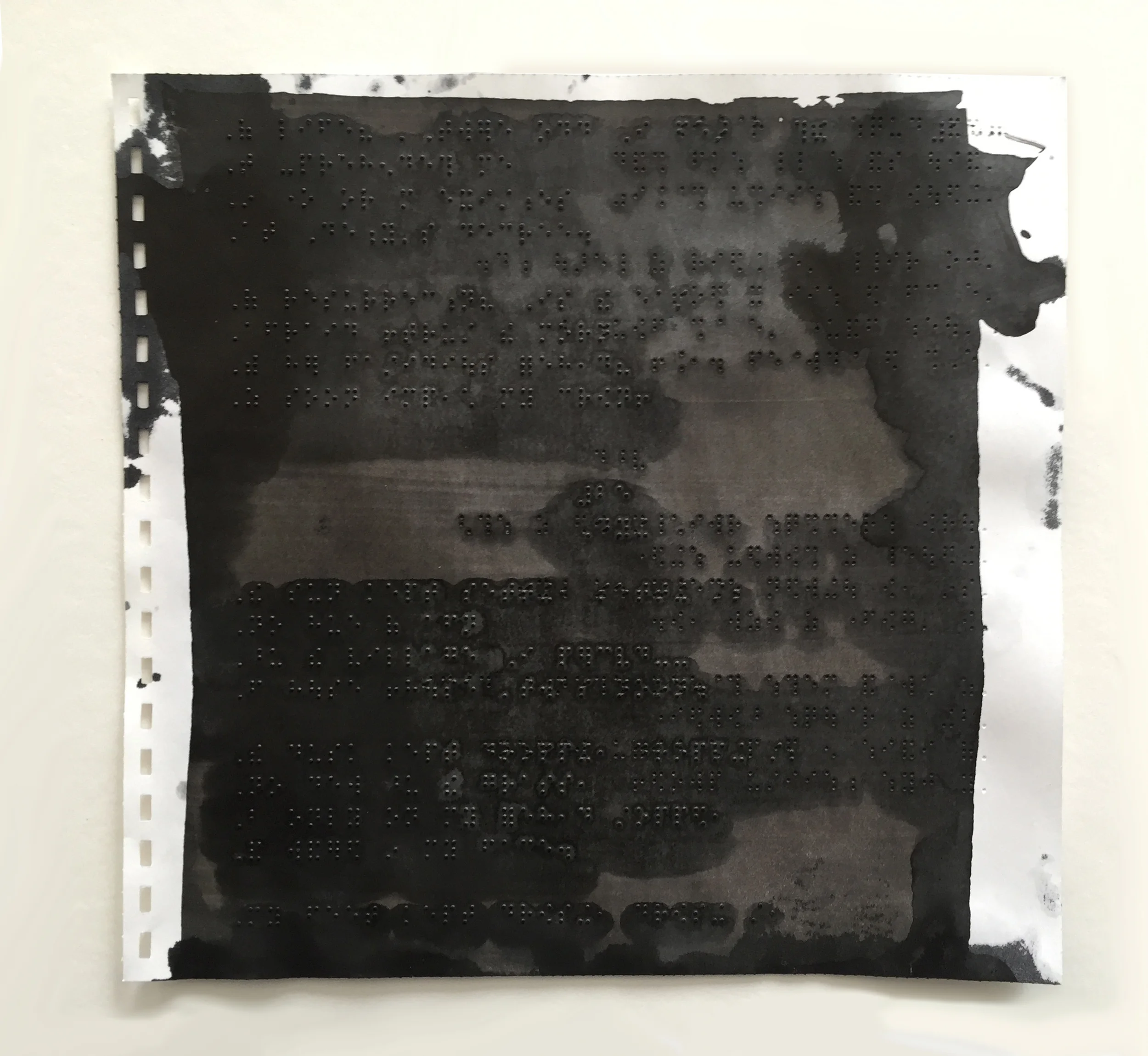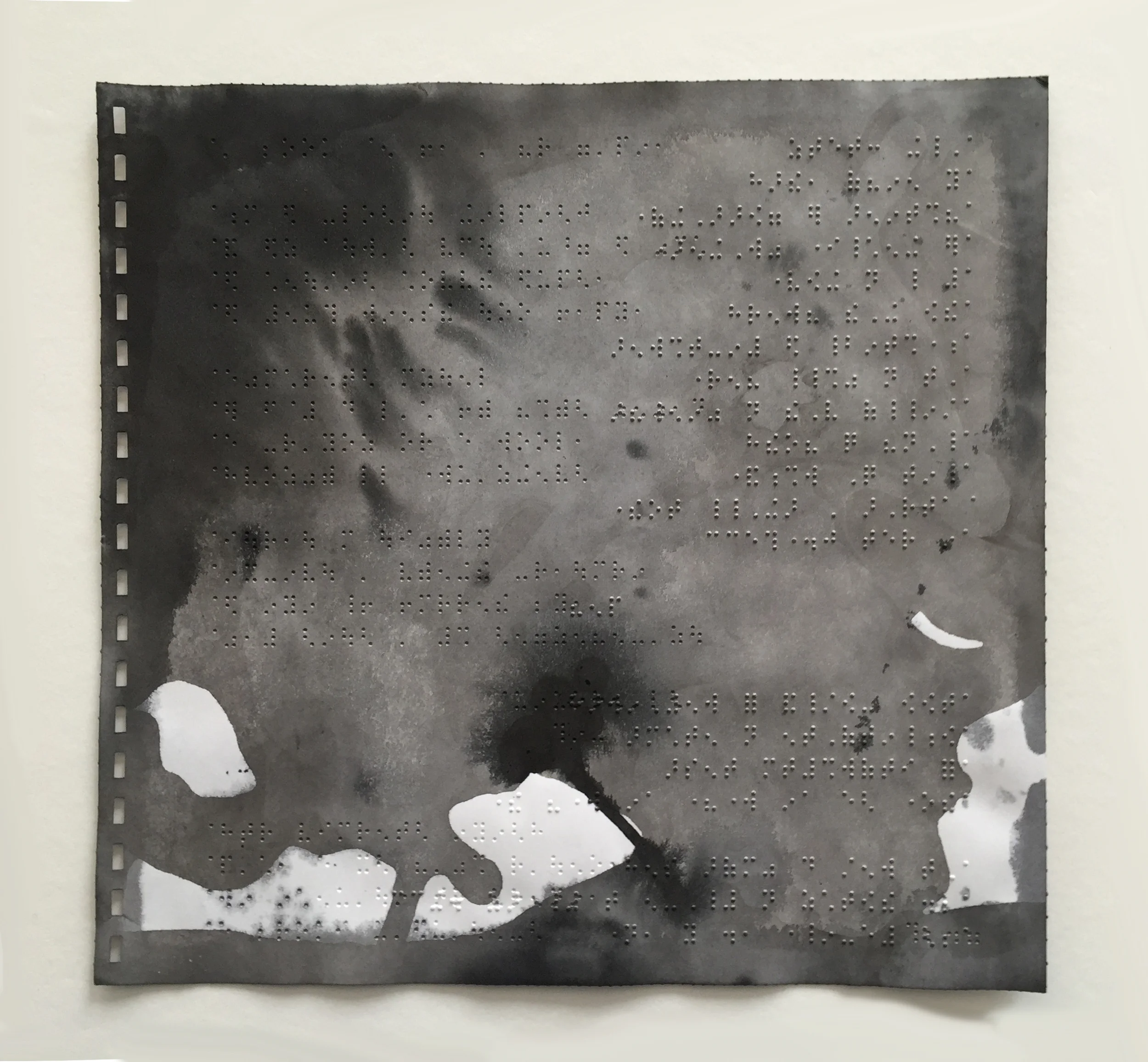 These pieces are from a book of Emily Dickinson poems in Braille. For pages 65 through 76, I dipped my fingers in ink, closed my eyes, and typed Dickinson's poem Two Worlds.