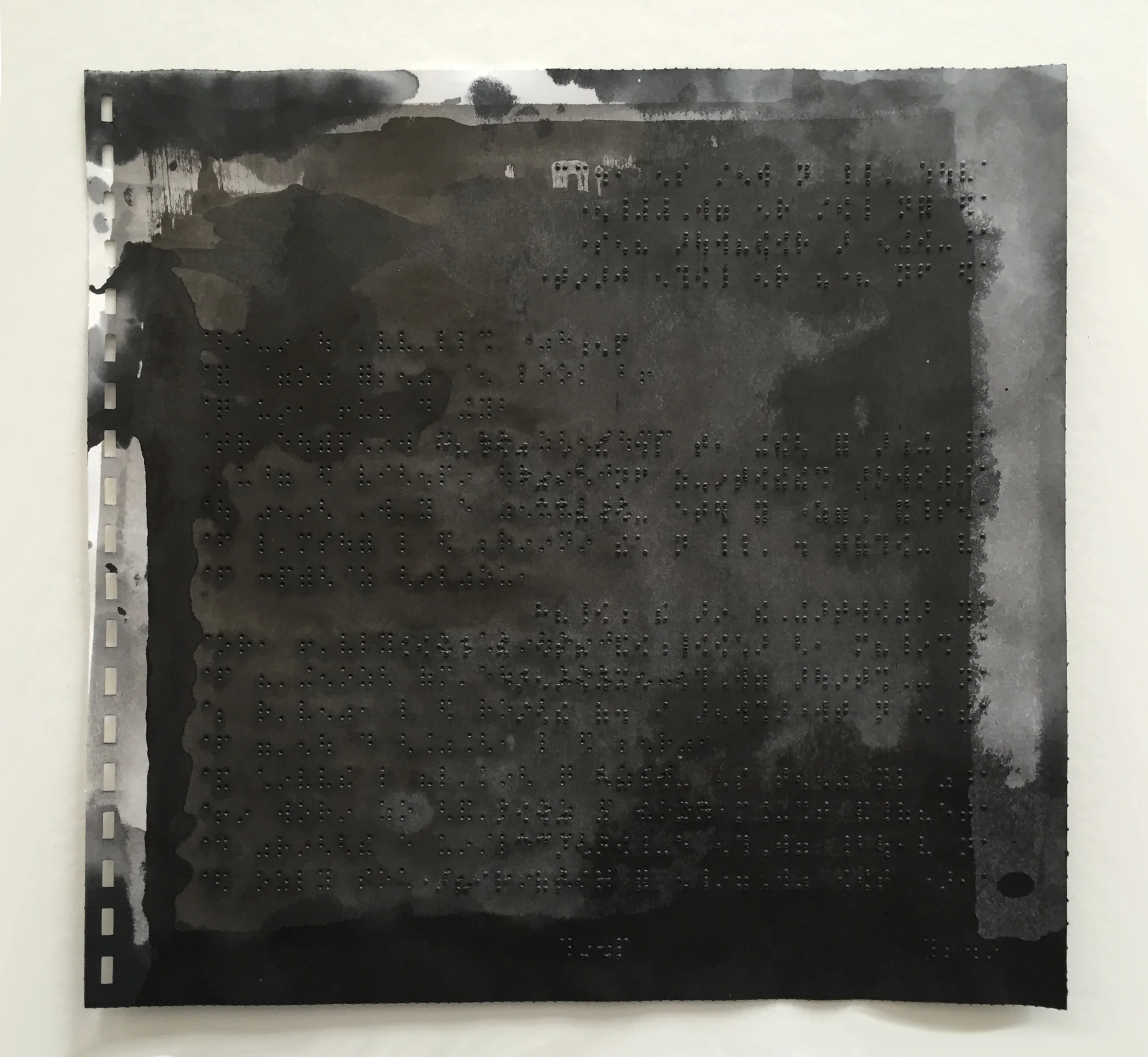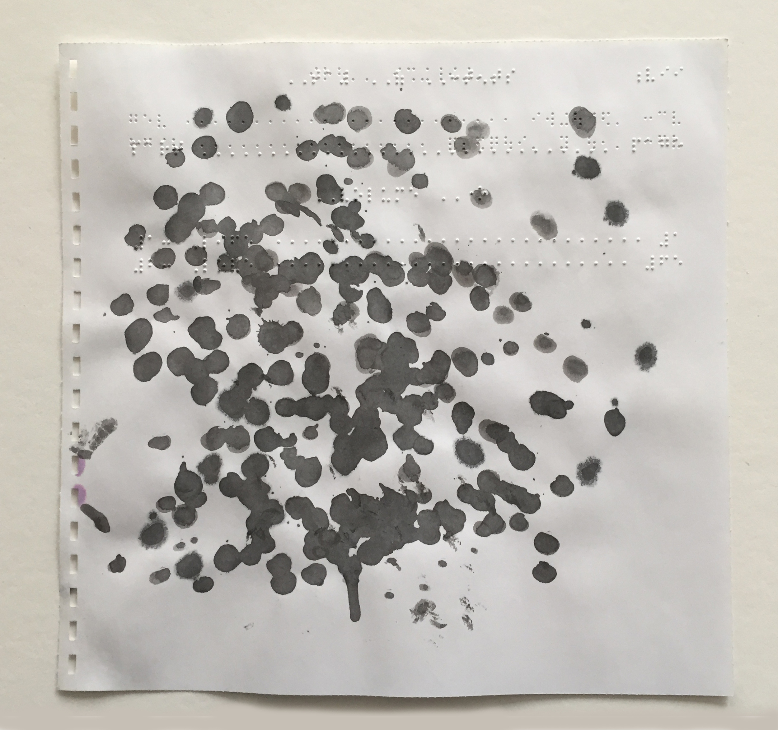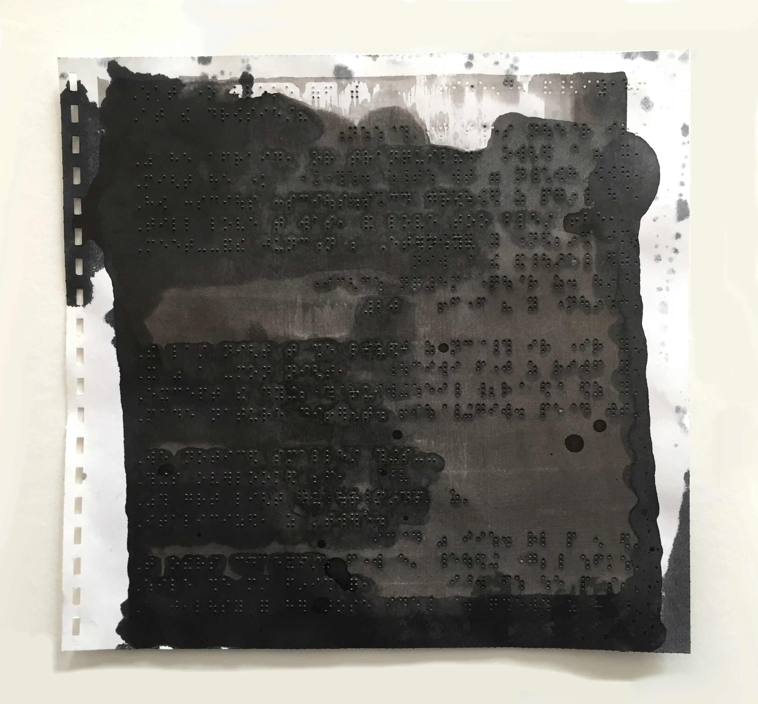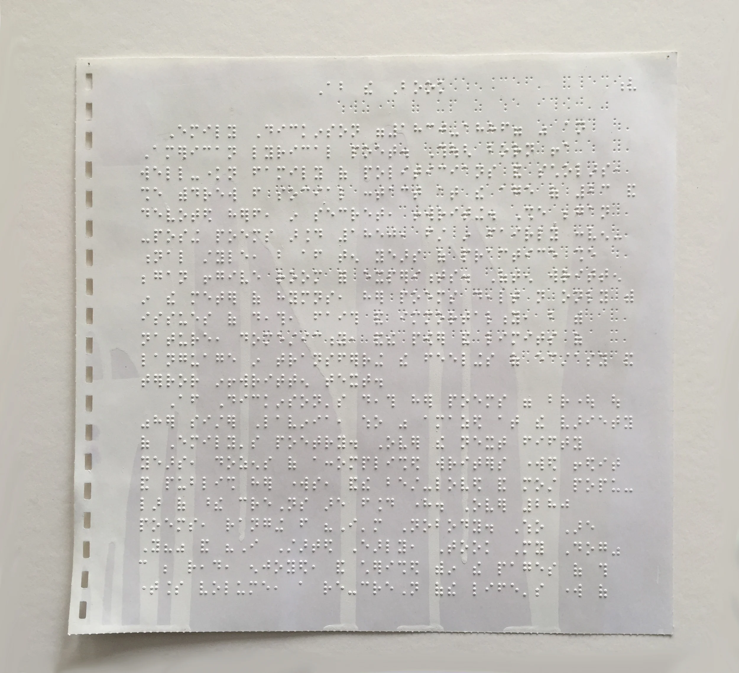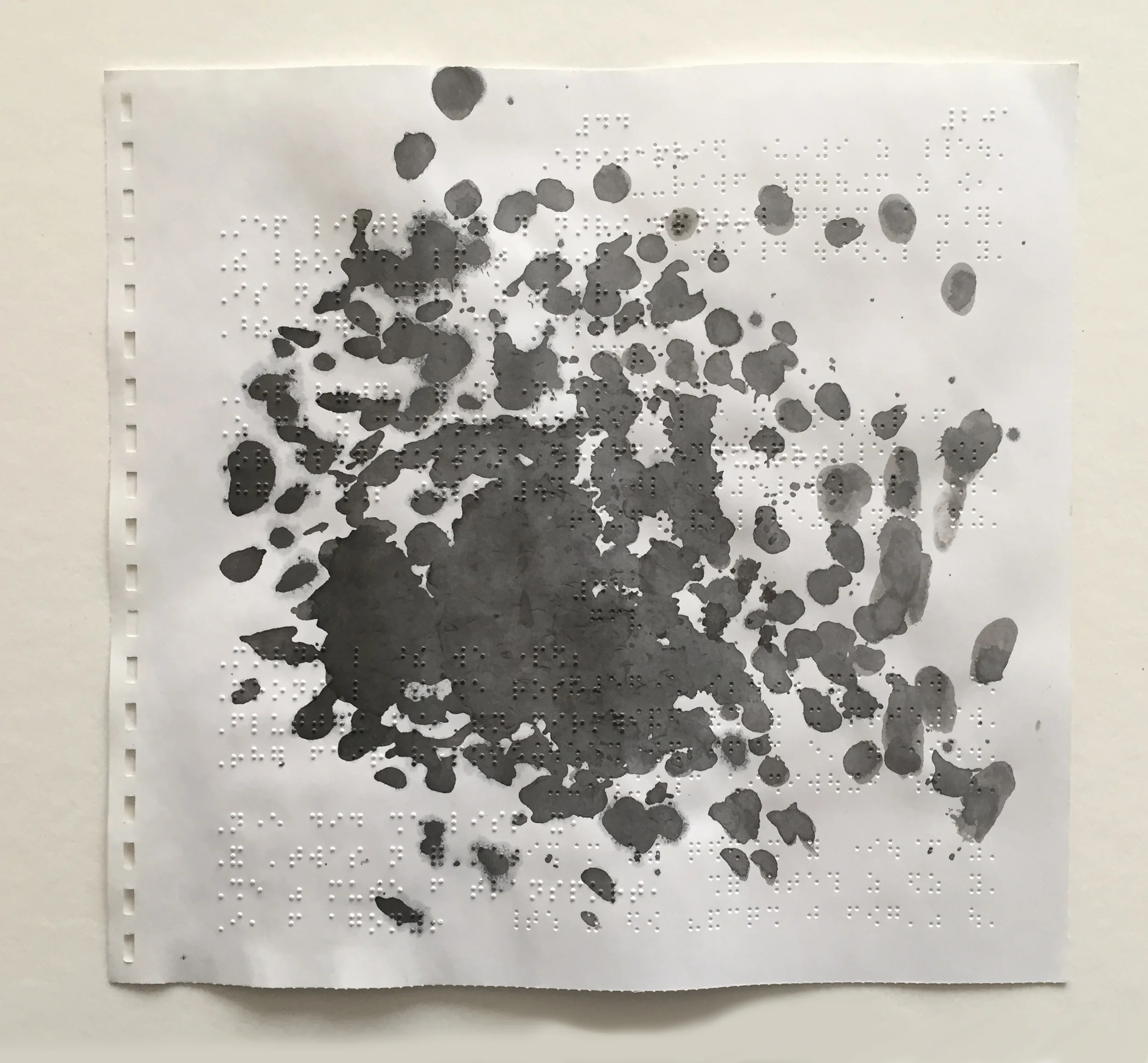These pieces are from a book of Emily Dickinson poems in Braille. For pages 65 through 76, I dipped my fingers in ink, closed my eyes, and typed Dickinson's poem Two Worlds.